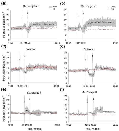 Mean HR within groups of Pinna nobilis specimens sampled from Sv. Nedjelja (a,b), Dobrota (c,d) and Sv. Stasije (e,f), before, during (between dashed lines) and after experimental treatment. Abbreviations: ctrl—control (red dotted lines); white head arrows—onset of salinity change by distilled water; black head arrows—onset of restoration of initial salinity values by salt addition; I—the first experiment; II—the second experiment.