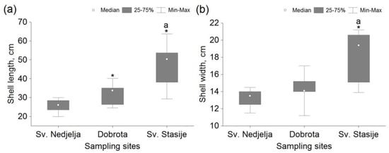 Antero–posterior shell length (a) and width (b) of Pinna nobilis sampled from Sv. Nedjelja (n = 12), Dobrota (n = 9) and Sv. Stasije (n = 7) within the Boka Kotorska Bay. *—statistically significant difference (p < 0.05) in comparison with the reference site (Sv. Nedjelja); a—statistically significant difference (p < 0.05) in comparison with the other sampling site; n—number of specimens.