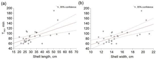 Furthermore, a significant correlation (p < 0.05) was observed between the data for Trec and shell length (p = 0.000528; r = 0.59; Figure 6a), and Trec and shell width (p = 0.0000875; r = 0.65; Figure 6b). On the other hand, in comparison between Hrrest and shell length, a significant correlation was not observed (p = 0.029318; r = −0.36; Figure S2a), nor between Hrrest and shell width (p = 0.033571; r = −0.35; Figure S2b).