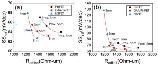 - Das, U.K.; Bhattacharyya, T.K. Opportunities in device scaling for 3-nm node and beyond: FinFET versus GAA-FET versus UFET. IEEE Trans. Electron. Devices 2020, 67, 2633–2638. [Google Scholar] [CrossRef]