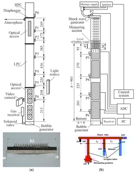 There are many publications on the processes inherent in PDH operation, including SW propagation in BW, submerged gas jet penetration and bubble formation, SW coalescence, etc. The basic phenomenon in the PDH is SW propagation in compressible BW. This phenomenon was earlier studied experimentally in a vertical hydroshock tube [4,5] containing a high-pressure chamber (HPC) and low-pressure chamber (LPC) separated by a bursting diaphragm, and a measuring section filled with BW with a certain volumetric gas content α. In experiments, after the rupture of the bursting diaphragm, an SW of known intensity (very weak, weak, or strong depending on the gas pressure in the HPC) was formed in the LPC and transmitted to BW. The evolution of SW velocity and other parameters in BW was monitored with pressure sensors mounted along the measuring section and with a high-speed video camera through optical windows. Experiments on very weak (quasiacoustic) SW propagation in BW with different α [6] showed that the speed of sound passed through a deep minimum as α increased from zero to 100% and was much less than the speed of sound in pure water (1500 m/s) and in pure air (340 m/s). This result corresponded well to the known theoretical relationships [7,8]. Experiments on weak SW propagation in water with air bubbles at α ranging from 1 to 20% showed [9] that the SW velocity in BW was supersonic and varied from 150 to 100 m/s when α increased from 2 to 5%, and it dropped to 50 m/s when α increased to 20%. The measured velocity of an SW reflected from a rigid wall appeared to be higher than that of the incident wave because of bubble shrinking in the BW compressed by the incident SW and therefore the lowering of α. Video recording of single bubble motion behind a weak SW in BW with α ≈ 1–3% showed [10] that the shock-induced bubble velocity attained a value of 3–4 m/s. Experiments with strong SWs in BW with α ranging from 0.5 to 6% showed [11] that the measured SW velocities were considerably greater than those registered in [9], other conditions being equal, and it attained 400 m/s at α = 2% and 250 m/s at α = 5%. Depending on BW parameters such as bubble size, gas thermal conductivity, liquid viscosity, etc., the SWs propagating in BW were found to exhibit various pressure profiles [12,13], namely, with a smooth or oscillatory pressure time history [14]. Experiments with SWs propagating in BW with α = 8% and air bubbles 0.1, 0.48, and 0.69 mm in diameter indicated [15] that the pressure oscillation frequency behind SWs decreased with bubble diameter. The authors of [16] used high-speed photography and image post-processing to register time-resolved structural changes in a submerged gaseous jet emanating from a Laval nozzle. In [17], the results of experimental study on gas jetting by an underwater detonation tube were reported, and the mechanism of shock wave propagation and bubble deformation was discussed. The effect of the nozzle attached to a detonation tube on the underwater SW and gas detonation bubble was investigated in [18]. Three types of nozzles (converging, straight, and diverging) were examined. The converging nozzle was shown to enhance water–gas mixing and increase the peak pressure of the SW compared with the straight nozzle as well as to essentially inhibit the bubble pulsation process. The diverging nozzle was shown to suppress water–gas mixing, increase the gas jet velocity, and enhance the bubble pulsation process. High-speed photography, digital particle image velocimetry, underwater pressure field measurements, and CFD calculations were used in [19,20] to study the two-phase flow nearby the open end of the detonation tube submerged in water. Stoichiometric explosive mixtures of methane, hydrogen, and acetylene with oxygen were detonated in the tube under the same fill conditions. The oscillation frequencies and directional growth of the detonation gas bubble were investigated. The dynamic behavior of the bubble in the first oscillation was found to be very similar to that of a conventional underwater explosion.