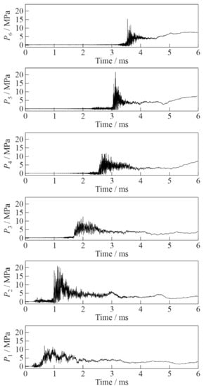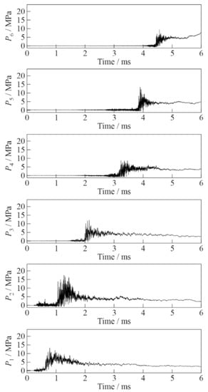 Records of pressure sensors P1 (bottom) to P6 (top) in the experiment with active bubbly water (α = 2%, P0,HPC = 0.6 MPa).