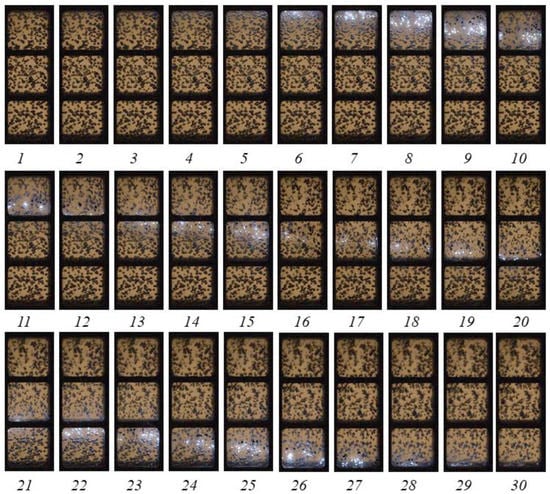 The bubble generator was made in the form of a steel plate 9 mm thick, in which 50 capillaries with an inner diameter of 0.26 mm were mounted in the nodes of a square grid with a step of 10 mm. Gas (air or a premixed C2H2 + 2.5 O2) was supplied to the bubble generator from the receiver with a volume of 6 L at a given pressure through the solenoid valve. The volumetric content of gas, α, in BW depended on the initial pressure in the receiver, the value of which was determined during preliminary experiments. For the sake of convenience, in what follows, water with air bubbles will be referred to as inert BW, and water with bubbles of a reactive gas mixture will be referred to as active BW.