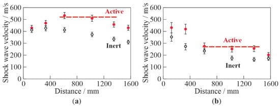 Figure 6 compares the measured dependences of the average SW velocity on the distance traveled in inert and active BW at two values of α: 2% (Figure 6a) and 10% (Figure 6b). Although the SW structure in active BW did not contain a solitary wave inherent in bubbly detonation [42,43,44,45,46] (see Figure 4), the SW velocity in active BW was approximately 100 m/s (at α = 2%) and 50 m/s (at α = 10%) higher than in inert BW with other conditions being equal. In other words, the replacement of inert bubbles with active bubbles increased the SW velocity significantly: by 20–30%. The increase in the SW propagation velocity in active BW was obviously caused by chemical energy deposition due to shock-induced explosions of individual bubbles. At a segment between 600 and 1200 mm, the SW velocity in active BW was about constant and equal to ≈500 m/s at α = 2% and ≈270 m/s at α = 10% (horizontal dashed lines in Figure 6a,b, respectively). A further decrease in the SW velocity with distance could be attributed to the nonuniform structure of BW closer to the bubble generator near the tube bottom, in particular at α = 2%. As compared to the bubbly detonation velocity measured in [44] for active BW with bubbles of acetylene–oxygen mixture at α = 2% (≈650 m/s), a constant propagation velocity of 500 m/s in the present experiments was 23% less, but it was attained at a considerably shorter distance: 600 mm vs. 2300 mm in [44]. The latter is important for practical applications in the small-scale PDH, because the elevated SW velocity could allow increasing the PDH operation frequency and thrust. As the constant-velocity mode of SW propagation in active BW is associated with shock-induced explosions of individual bubbles, this mode will be further referred to as bubbly quasidetonation.