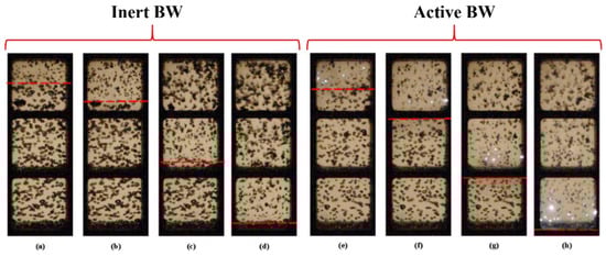 Figure 7 is plotted for better understanding the difference between SW propagation velocities in inert and active BW. It compares video frames of experiments with inert and active BW at α = 2%. As in Figure 5, video recording was made through the top three windows of the lower optical section of the LPC. Note that pressure sensor P5 was installed 65 mm above the upper edge of the upper window, and sensor P6 was in the field of view in the lower window 10 mm below the horizontal bridge separating the lower window from the middle one. The red dashed lines mark the SW positions determined from the moments of the onset of bubble deformation between two successive video frames (at time intervals of 25 μs). During SW propagation in inert BW (upper row with frames (a) to (d)), the deformation and collapse of bubbles behind its front, as expected, did not lead to any glow. When SW propagated in active BW, bright flashes of light from explosions of individual bubbles were clearly visible. The average SW velocity in the tube section under consideration, obtained from the processing of video records of experiments with inert and reactive gas bubbles, was 320 and 400 m/s, respectively. These values were very close to the SW velocities determined from the shock front arrival time at sensors P5 and P6: 310 and 430 m/s, respectively (see Figure 6a). In Figure 7, during the exposure time of one frame Δt = 25 µs, the SW front traveled a distance Δx ≈10 mm. Individual frames show all the bubbles reacted over a time interval of Δt and were located in a band with a width of Δx. It is interesting that the luminous exploded bubbles were located at a distance of 10–20 mm behind the SW front; i.e., their self-ignition delay was 25–50 μs. Thus, the pressure fluctuations in the records of Figure 3 and Figure 4 were associated with shock-induced fluctuations of gas bubbles, and the peak pressure fluctuations in Figure 4 were associated with bubble explosions.