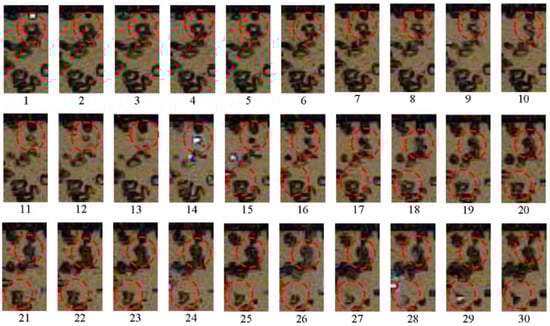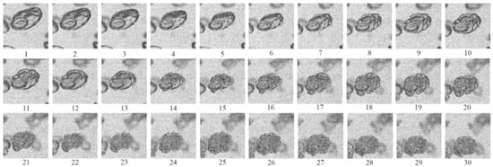 Video frames of SW propagation in inert bubbly water at α = 2%, ΔP = 0.13 MPa, and D = 100 m/s. The sizes of the bubbles in the foreground and background are d0 = 2.5 mm and 4.5 mm, respectively. Frames are numbered sequentially from 1 to 30 with an interval of Δt = 50 µs.