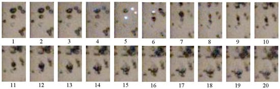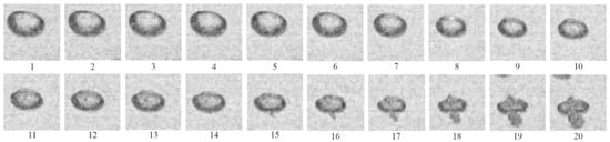 Figure 11 shows fragments of video frames for the same experiment as shown in Figure 7e–h relevant to active BW. As the SW propagated from top to bottom, several closely spaced bubbles were first compressed (frames 1–4). Then, three bubbles with a diameter of d ≈2 mm exploded almost simultaneously (frame 5). Thereafter, a larger bubble with a diameter of d ≈3.5 mm exploded with a time delay (frame 6), despite it being subjected to shock compression earlier, being somewhat upstream with respect to the two bubbles that exploded earlier. Furthermore, this bubble expanded (frame 7), shrank again (frame 8) and expanded again (frames 9–11), taking the shape of a parachute (frames 12–14), and then broke up into small fragments (frames 15–20).