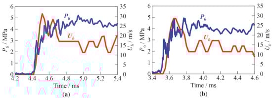 The processing of video records made it possible to gain information on the shock-induced motion of individual bubbles behind the traveling SW. Thus, Figure 12a,b show the measured time histories of the bubble velocity in inert and active BW, respectively. In both cases, the bubble initial position was chosen near pressure sensor P6. The corresponding records of pressure sensor P6 are also shown in Figure 12a,b. The pressure records were averaged over time intervals equal to the exposure time of video frames (25 μs). The pressure profiles behind the SWs in both cases were almost identical. The initial ascending parts of curves Ub(t) and their maxima (100–200 µs after SW arrival) corresponded to the velocity of the initial bubble, whereas the plateaus following the decline of the curves corresponded to the velocity of bubble microfragments formed after shock-induced bubble fragmentation. The plateau at the Ub(t) curves represented the equilibrium velocity of phases (gas and water) behind the traveling SW. The bubble velocity fluctuations on the plots were the results of errors in determining bubble coordinates during data digitization. Quantitatively, in both cases, the velocities of initial bubbles in the SWs reached the value of ≈30 m/s, while the velocities of bubble microfragments in Figure 12a,b decreased to ≈17 m/s and ≈13 m/s, respectively, after about 1 ms after the passage of the SW. With additional averaging over time (in the interval of 0.25 ms after SW arrival) and over the ensemble of bubbles, the average bubble velocity in the tests of Figure 12a,b was 24 m/s and 25 m/s, respectively. Thus, in relatively weak SWs (at P0,HPC = 0.6 MPa), the characteristic velocities of chemically inert and active bubbles in BW with α = 2% were approximately identical; i.e., bubble explosions did not contribute much to the SW-to-BW momentum transfer.