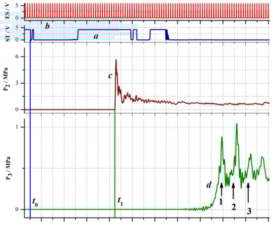 Typical recorded signals in an experiment with SW package propagation in BW at α = 2%: (a) a signal triggering the video camera, ST; (b) electronic shutter, ES; (c) pressure sensor P2, and (d) pressure sensor P3; numbers 1, 2, and 3 indicate the successive SWs.