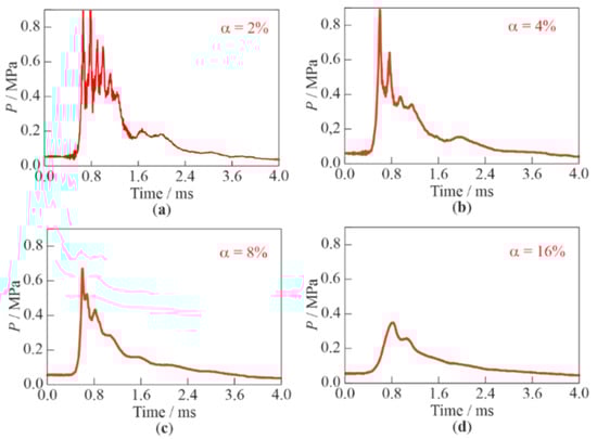 Figure 14 shows examples of records of pressure sensor P3 for different values of α. The following specific features of SW package propagation in BW can be highlighted. Firstly, the shape of the leading front of the wave package in BW differs significantly from the shape of an SW front in gas: the time of pressure rise in the front of the SW package in BW varies from 0.2 (Figure 14a–c) to 0.4 ms (Figure 14d). Secondly, as α increases, the time intervals between the individual pressure maxima in the successive SWs decrease, i.e., the SWs catch up with each other and merge, and the profile of the SW package is smoothed and approaches a triangular shape. These effects are associated with a stepwise decrease in the volumetric gas content after each successive SW and, accordingly, with an increase in the low-frequency speed of sound in BW ahead of each successive SW (see Table 1). Thirdly, with an increase in α, the SW amplitudes in the SW package decrease, which is consistent with the decrease in the propagation velocity of its leading front noted above (see Table 1).