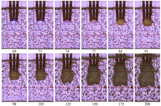 For illustration, Figure 15 shows video frames of the penetration of detonation products from three successive detonation waves into BW at α = 2%. The first detonation wave enters BW from the central acceptor tube (frame #70); then, with a delay of ≈140 µs (frame #77), the second detonation wave leaves the right acceptor tube, and after another ≈140 µs (frame #84), the third detonation wave leaves the left acceptor tube. With the growth of the product gas bubble, the height of the BW column noticeably increases (in frame #200, it comes close to the upper border of the image). It is interesting that the shape of the product gas bubble does not show any signs of asymmetry: over time, the product gas bubble is elongated mainly in the longitudinal direction, while its transverse dimensions change insignificantly.