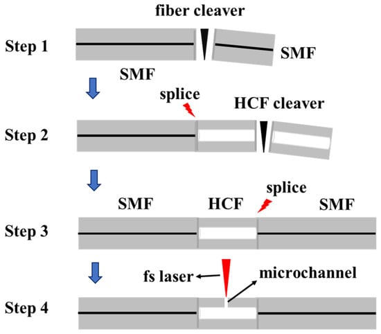 Figure 1 shows a splicing process between a HCF with an inner diameter of 30 μm and a standard SMF (YOFC, 9 μm/125 μm). First, the coating layer of SMF is removed with a fiber stripper to expose its cladding layer, and the fiber is cleaved and cleaned to obtain a flat end face. The HCF is burned with a flame to remove its coating layer, and then is cleaved by a fiber cutting knife to obtain flat end faces as well. Then, both ends of the HCF are fused to the SMFs, resulting in a SMF-HCF-SMF structure, as illustrated in Step 3. As shown in Step 4, the air hole structure was fabricated by the femtosecond laser drilling in the hollow-core fiber fixed on a three-dimensional machining platform.