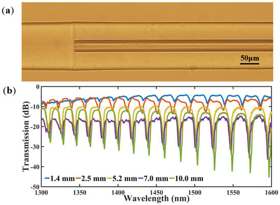 Figure 2a shows a microscopy image of a junction between a HCF with an inner diameter of 30 μm and a standard SMF. Figure 2b presents the interference spectra of the optical fiber sensor corresponding to a HCF with different lengths. It can be seen that the resonance peak intensity of the transmission spectrum gradually increases as the HCF length increases.
