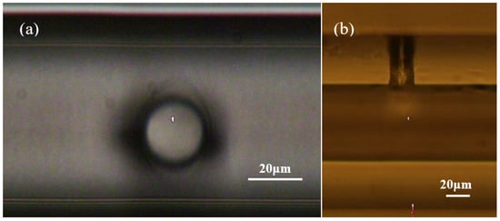 As shown in Figure 2b, the resonance peaks associated with the HCFs with the lengths of 1.4 mm and 2.5 mm are less than 5 dB, which are too low for accurate data analysis. When the length of the HCF extends to 10 mm, such fiber sensors are too big and not suitable for compact packaging. Fortunately, the resonance peak intensity of the HCF between 5 and 7 mm is greater than 10 dB, which fully meets the experimental requirements. In the subsequent experiments, the HCF with the length of about 6 mm was selected for fusion splicing with the SMF. The spliced structure was then subjected to laser drilling by a femtosecond laser (Coherent, Santa Clara, CA, USA) with the wavelength of 800 nm, the pulse width of 35 fs, and the laser energy of 50 μJ. The femtosecond laser pulses were focused on the middle top of the HCF with a 50× microscope objective, and a hole was ablated in less than 5 s with a programmed three-dimensional stage moving upward in the vertical direction at a speed of 10 μm/s. In addition, a refractive index matching liquid was applied to the HCF during both the femtosecond laser processing and microscopic imaging, which eliminated the adverse effects of spherical aberration on the experiments. The dimension (diameter and distance) accuracy of the small holes could be as small as 1 μm by use of a self-built micromachining station.