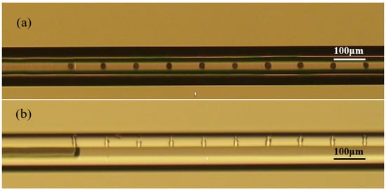 Figure 3 presents microscopy images of a single micro-hole in an HCF drilled by a femtosecond laser, showing the micro-hole has a round shape and a diameter of about 20 μm. It can be seen from Figure 3b that the micro-hole has almost vertical inner walls and the interior of the HCF is well connected to the outside atmosphere. Figure 4 presents microscopy images of ten micro-holes in an HCF drilled by a femtosecond laser. The ten micro-holes are equally arranged along the axial direction of the HCF, with a spacing of 100 μm between the holes and a diameter of 20 μm. All these images were taken by an Olympus BX 51 microscope under transmitted illumination. In order to verify the connectivity of the ten micro-holes, the HCF was filled with water to obtain a clear profile of the micro-holes, as shown in Figure 4b. Note that the dark region under the left micro-hole in Figure 4b is an interface between the air and water in the hollow core.