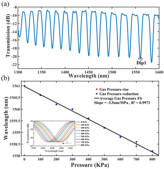 Figure 6a shows an initial spectrum of the single-hole gas pressure sensor, in which the length and the inner diameter of the spliced HCF is 6 mm and 30 μm, respectively. It can be seen that the resonance peak intensity of the interference spectrum gradually rises with the increase in wavelength. As a result, the resonance peak near 1550 nm (Dip1), with an interference intensity of about 12 dB, is selected as the object of study.