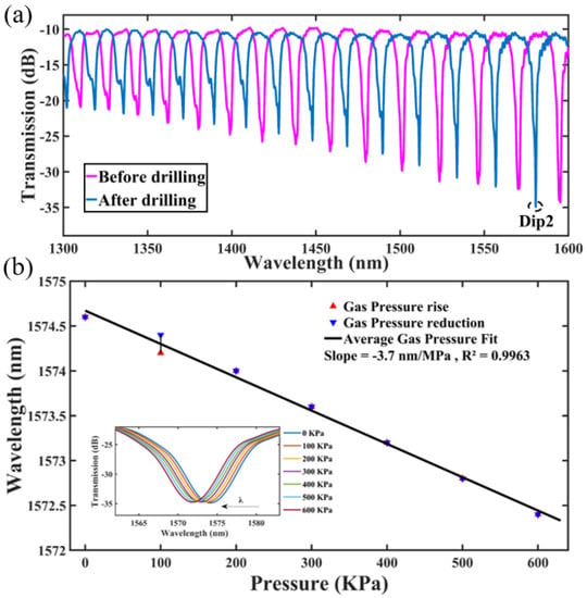 The sensitivity measurement of the ten-hole gas pressure sensor is almost the same as that of the single hole sensor. At first, the air pressure in the airtight chamber slowly rises from 0 MPa to 0.6 MPa, while the Dip2 wavelengths (see Figure 7a) are recorded every 0.1 MPa. The spectral drift with air pressure is presented in the inset at the lower left corner of Figure 7b. Then, the air pressure slowly decreases from 0.6 MPa to 0 MPa. At the same time, the Dip2 wavelengths are also recorded every 0.1 MPa. Figure 7b shows linear fits of the response curves. The linearities of the rising and falling curves are 99.43% and 99.47%, and the sensitivities of the Dip2 wavelength are −3.643 nm/MPa and −3.786 nm/MPa, respectively.