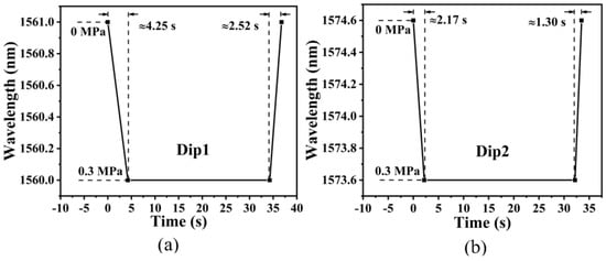 Response time is an essential parameter to judge the performance of the fiber optic air pressure sensor. Here, the response time of one-hole and ten-hole air pressure sensors are measured with the experimental setup in Figure 5a. Firstly, the sensing head was placed in the airtight chamber, and the Dip1 wavelength was recorded when the air pressure was set at 0 MPa. Then, the chamber pressure was rapidly increased to 0.3 MPa, and the time of Dip1 drift after the pressure reach 0.3 MPa was recorded. After holding for 30 s, the chamber pressure was rapidly dropped from 0.3 MPa to 0 MPa, and the time of Dip1 drift after the pressure reach 0 MPa was recorded again. The above measurements were repeated six times, and the ramp-up and the ramp-down average response times are illustrated in Figure 8. It can be seen that the response speed of the ten-hole sensor is twice as fast as that of the single-hole sensor. We expect that the faster response speed is caused by the smaller resistance of air entering into the HCF with more holes. It is worthy to note that the response time would be shorter by machining an open microcavity directly on the fiber crossing the core layer, but this microcavity will seriously reduce the robustness of fiber sensor. Multiple micro-holes in an HCF offer a pathway to raise the response speed of air pressure sensors but keep its robustness to high pressure environment.