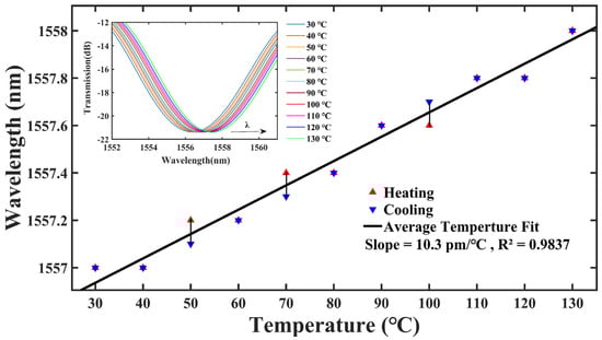Figure 5b shows a diagram of the temperature experimental setup of the single-hole sensor, its sensing head was placed in a temperature-controllable tubular heating furnace, and the temperature was gradually increased from 30 °C to 130 °C by the program setting, while the spectral data were recorded every 10 °C, as displayed in the upper left inset of Figure 9. When the temperature rose, the wavelength of the resonance valley Dip1 of the single-hole sensor was red-shifted, and its intensity barely changed. The linear fit of the resonance valley Dip1 is 98.37%, its temperature sensitivity is 10.3 pm/°C, with the cross-sensitivity of temperature being 2.9 kPa/°C (0.0103/3.548 = 0.0029 MPa/°C), indicating that the device has a very small cross-sensitivity to temperature changes.