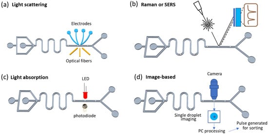 The absorbance of target-containing droplets has also been used as label-free detection signals which, therefore, can trigger the sorting of droplets (Figure 3c). Limited to optical path length, the sensitivity of absorbance measurements can be improved by the elongation of the channel, extension of residence time, or integration of other techniques such as fluorescence-based and UV–vis spectra-based techniques [122,123] Future development may extend to full absorbance spectra and integrate analysis by artificial intelligence [124,125]. Due to the advances in cameras, processing hardware, and machine learning software with image processing algorithms, bright field images of droplets have been able to be real-time captured and processed into signals for droplet sorting (Figure 3d) [126]. Image-based detection overcomes the limitation of flow cytometers in distinguishing objects with similar sizes and morphologies [127]. To enhance the accuracy and efficiency of detection, deep learning algorithms have been increasingly used to classify images for further droplet sorting and selection [125]. Overall, the cost and throughput of absorbance detection methods depend on the choices of optical detection instrumentation, which vary vastly. Nevertheless, the specificity of this method remains fairly low.
