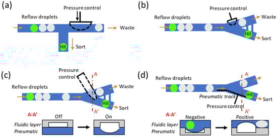Both single-layer valves and multi-layer valves have been implemented into the microfluidic system to perform the droplet sorting function. In the case of single-layer valves, Abate et al. first proposed the single-layer valve system which positions an adjacent pneumatic channel next to the main streaming channel to achieve the droplet sorting function by actuating the thin sandwich membrane with positive pressure (Figure 4a). The positive pressure would extrude the thin membrane into the main channel to obstruct the fluidic flow and detour the upcoming droplets to another hit chamber [136]. Later, Abate et al. improved the system by simplifying the sorting design into a bifurcation structure and introducing the shunt structure to balance the fluidic resistance to minimize the sudden pressure fluctuation, as well as replace the adjacent channel to a valve that directly points towards the tip of the Y junction [137]. Due to the calibrated asymmetric design of the microchannel, the mainstream droplet would go directly to the “waste” channel if the valve is not actuated. When the valve is actuated, the fluidic resistivity dynamic would be slightly changed so that the target droplet would be guided toward the opposite channel as the “hit” droplet (Figure 4b). In the case of multi-layer valves, with a similar concept aiming to disturb the fluidic dynamic by sudden channel deformation, Jin et al. introduced another method to achieve droplet sorting in the format of a bilayer valve [138]. The pneumatic valve is aligned and placed on the top of the fluidic channel; therefore, it can improve the sorting performance and reduce the minimal valve actuation time (Figure 4c). Zhang et al. introduced bilayer dynamic pneumatic rails to enable droplet sorting by adjusting the pressure balance between oil and the pneumatic channel [139], presentting good accuracy but fairly low throughput (Figure 4d).
