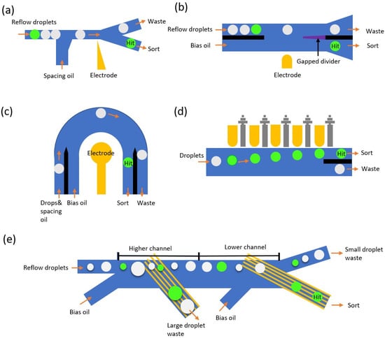 Instead of controlling the waste droplet steam using the hydrodynamic resistance method, Sciambi et al. [142,146] developed an ultra-high-speed droplet sorter that utilized a spacing oil flow bias of the droplets to the channel side away from the electrode (Figure 5b). The energized DEP electrode then attracts the droplet while triggered. The droplets then move downstream to a longer divider with part of it squeezed by the gap. Due to this change, the small lateral displacement by DEP will increase—since the droplet travels downstream—and force the droplet into the hit channel, while the non-affected droplets will remain on the other side. Since the first displacement by the electrode is small, the operating time needed for one droplet is relatively short. The first improvement of this design is the addition of oil bias flow. The initial lateral displacement provided by the bias oil flow could improve the rejection of false positives and false negatives, which are caused by imbalanced hydrodynamic resistance. Besides, they introduced a soft-gapped divider, and this divider could help to reduce the droplet splitting and tip streaming issue [142] while screening at a high flow rate. This results in an ultrafast sorting speed with the highest rate ever reported of approximately 30 kHz. Although most droplets could be correctly sorted, certain errors cannot be neglected. For example, uniform spacing is crucial to the sorting process. High flow speed would cause the droplet to stack vertically in multiple layers and lead to irregular spacing and droplet size change. Reflowing droplets with an abnormally large or small size could also fail in sorting due to the non-uniformed droplet spacing caused by size change. One possible way to improve the sorting accuracy could be the removal of the incorrect-sized droplets by a filtration method before the sorting procedure [128,130,161,162,163,164,165,166].