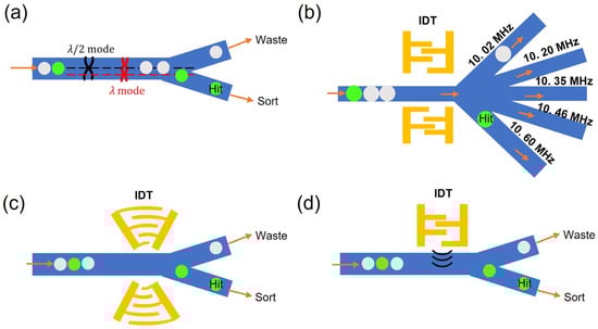 Variety of different versions of acoustic-based droplet sorters. (a) BAW droplet sorter that utilizes the switching of λ and λ/2 mode to achieve the droplet sorting towards different downstream channels. (b) A SSAW droplet sorter that can utilize two pairs of standard IDTs to sort droplets toward different downstream channels by using different actuation frequencies. (c) Developed single-phased, focused transducer method that utilized a revised IDT structure to achieve sorting with higher energy efficiency. (d) TSAW droplet sorter that pushes all droplets towards the bottom channel when switched on.