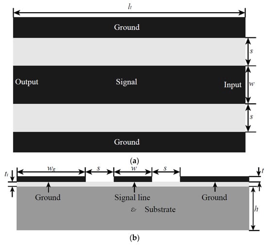 where , , , , , , and . Therefore, the characteristic impedance of the CPW transmission line can be obtained by Equations (1)–(3) once we obtain the CPW substrate material and structure.