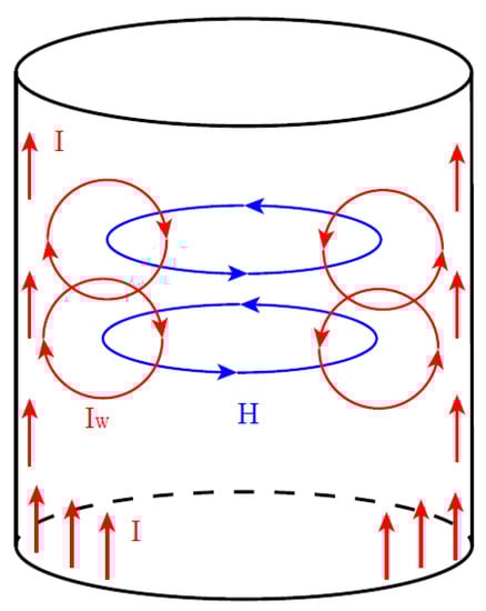 Figure 3 is the illustration of the eddy current. As shown in Figure 3, when a conductor is fed with a high-frequency alternating current I, a vortex magnetic field H is generated around the conductor current in the counterclockwise direction according to the fourth term of Equation (6). Accordingly, according to the third term of Equation (6), the vortex magnetic field generates a new vortex electric field, which in turn generates a vortex current (IW in Figure 3), i.e., electromagnetic induction. The closer to the center of the conductor, the stronger the vortex electric field generated by electromagnetic induction. As shown in Figure 3, near the inside of the conductor, the newly generated vortex electric field cancels out with the original electric field; near the surface of the conductor, it superimposes with the original electric field, which leads to the concentration of current inside the metal conductor at the surface of the metal conductor.