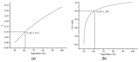 In practical engineering applications, the reflection factor of a CPW transmission line is generally required to be no less than 20 dB in absolute value. This translates into a dimensionless constant of 0.1, meaning that only 10% of the input signal is allowed to be reflected. Substituting 0.1 into Equation (13), a simple calculation shows that the CPW transmission line impedance is about 61.1 Ω. For the sake of description, 61.1 Ω is considered the CPW transmission line threshold impedance, and 20 dB is considered the CPW transmission line threshold reflection coefficient, as shown in Figure 5 for Γc and Sc. After the impedance value was greater than the threshold impedance, the CPW transmission line was considered to have an impedance mismatch with the signal source or test equipment, and the transmission line could not be used at that frequency. The next step was to analyze the theoretical results obtained in Section 2 by means of a specific model.
