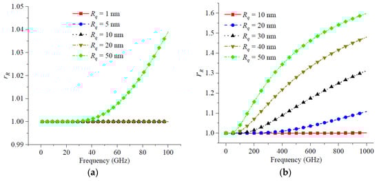 Figure 6 shows the roughness factors for different RMS surface roughness and the roughness factor at different operating frequencies. From Figure 6a, when the RMS surface roughness Rq was less than 50 nm, the roughness factor rR did not increase with frequency in the frequency range of 1 GHz to 100 GHz. When the RMS surface roughness Rq was equal to 50 nm, the roughness factor rR increased approximately in the frequency range from 1 GHz to 100 GHz. As the roughness factor measured the transmission line impedance, Figure 6a shows that for the transmission lines operating at 100 GHz, the RMS surface roughness had a limited effect on the impedance when the RMS roughness is less than 50 nm. Curran et al. [42] pointed out that the measured resistance of a transmission line with surface roughness was over 1.2 times to that of an ideal smooth transmission line. Gold et al. [28] showed that the insertion loss of a transmission line with RMS surface roughness of 1 μm at 65 GHz was about 3 times that of an ideal smooth transmission line. Therefore, higher surface roughness led to more significant effects on the transmission line performance.