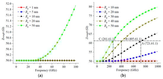Next, the surface roughness at high frequencies was studied from the perspective of CPW transmission line impedance. As shown in Figure 7a, when the RMS surface roughness Rq was less than 50 nm, the CPW transmission line impedance Zrough basically does not change with the increase of operating frequency in the frequency range from 1 GHz to 100 GHz. As Rq increased to 50 nm, the transmission line impedance Zrough increased by approximately 2 Ω over the frequency range from 1 GHz to 100 GHz. This was different from the previously proposed transmission line threshold impedance of 61.1 Ω. Therefore, the impedance mismatch caused by nanoscale surface roughness was basically not considered in the 100 GHz frequency range.