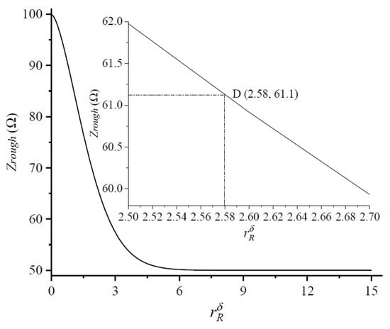 The correspondence between the modified roughness coefficient and the transmission line impedance is shown in Figure 8. After a simple calculation, the modified roughness coefficient was 2.58 when the threshold impedance was reached, which was defined as the threshold modified roughness coefficient, as shown at point D (2.58, 61.1) in Figure 8. It can be seen that the transmission line impedance increased as the modified roughness coefficient decreased. The threshold modified roughness coefficient, like the transmission line threshold impedance, was a measure of the reflection rate of the transmission line signal up to 10%. As can be seen in Figure 8, the use of a roughness factor simplified the formulation of the roughness problem. An impedance mismatch between the transmission line and the signal source occurred regardless of the RMS surface roughness of the transmission line and the operating frequency, if the roughness factor was less than 2.58.