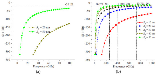 As shown in Figure 9a, the absolute value of the reflection coefficient was less than the threshold reflection coefficient by 20 dB over the entire operating frequency range from 1 GHz to 100 GHz when the RMS surface roughness Rq was not greater than 50 nm. Figure 9a shows that the RMS surface roughness had little effect on the reflection coefficient of the transmission line when the operating frequency was below 100 GHz.