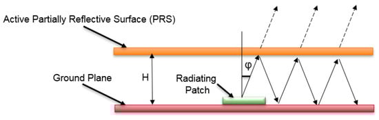The proposed beam-steerable PRS structure is designed at 5.5 GHz for beam switching purposes. The beam-steerable PRS structure consists of two parts: a directional patch antenna with coaxial feed which acts as a radiating element and a reconfigurable active PRS which is placed at a certain height above the patch antenna. By placing the active PRS over the radiating patch antenna, a Fabry–Pérot cavity is formed as shown in Figure 1. The radiations from the patch antenna experience multiple partial reflections and transmissions depending on the impedance provided by the active PRS. The passband and stopband filtering operation of the active PRS is controlled by the ON/OFF states of PIN diodes. The radiating beam tilts in the direction where it experiences low reflections.
