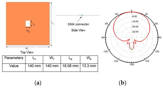 A coaxial feed microstrip patch antenna is designed at Rogers RT4003 substrate (with a thickness of 1.52 mm), which acts as the source antenna at 5.5 GHz. Its length and width are calculated using the mathematical formulations for a patch antenna (see Equations (1)–(3)) []. The radiating patch has dimensions of 13.3 × 18.08 mm2 at 5.5 GHz frequency. It has a boresight radiation pattern with a gain of 6.2 dBi. The antenna dimensions and radiation pattern are shown in Figure 2.
