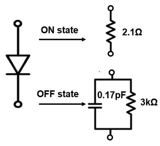 Two PIN Diodes are placed between a patch and an outer metallic ring as shown in Figure 3a. The metallic strip is incorporated at the bottom side of a unit cell to provide biasing to the structure. The outer metallic ring is used for grounding purposes. The unit cell is excited with two Floquet ports shown in Figure 3c, Master-slave boundaries are used to model the periodic structure of the unit cell in the x and y direction. The PIN diodes are modeled as a lumped element circuit having a resistance of 2.1 Ω for the ON state, while for the OFF state, a parallel circuit composed of 0.17 pF capacitor and 3 kΩ resistor is employed as shown in Figure 4. The dimensions of the proposed unit cell are given in Table 1. All the parameters are chosen in such a way that when a PIN Diode changes its state from ON to OFF, there is a change in reflection magnitude & transmission phase.