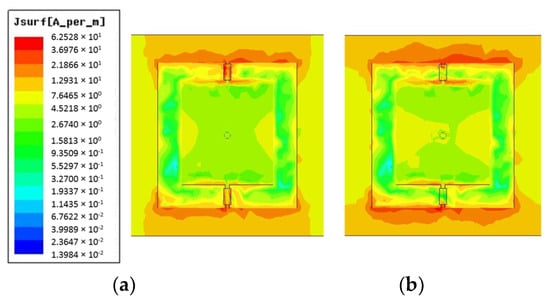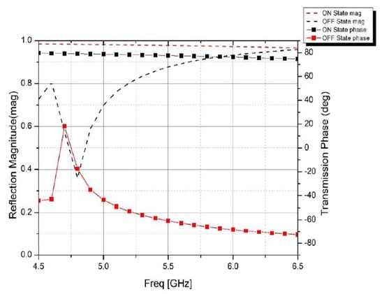 Figure 5 shows a comparison of surface current distributions at ON and OFF states. The majority of the current passes through the middle diode and up to the end of the middle bar. It is then symmetrically divided and runs along the boundaries of the patch. The magnetic field forms a loop around the middle bar in response to the surface current distribution. The EM energy is stored in the loop, which prevents the plane wave from going through. When the top layer is in transmission mode, the surface current on the biasing network decreases dramatically, indicating that the magnetic loop trap becomes weak, and the EM wave can pass through. The reflection coefficient and transmission phase of the proposed unit cell is illustrated in Figure 6. It is evident that the reflection magnitude for the OFF- and ON-state are 0.87 and 0.97, respectively. The transmission phase varies from 77.5° in the ON state to −60.86° in the OFF state which exhibits a phase difference of 16.7°.