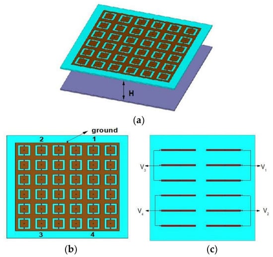 Following the working principle of a phased array antenna source, the antenna beam is shifted toward that side where the phase lags []. The reconfigurable FSS model is divided into four parts with each part consisting of 6 × 6 unit cells as shown in Figure 7. Each section has 3 × 3 reconfigurable unit cells. A total of 72 PIN diodes are used in the AFSS. An identical biasing network is designed for all four sections. It consists of thin metallic biasing strip-lines and biasing pads for voltage inputs, which can be seen from Figure 7 named sequentially as V1 to V4. The biasing strip lines are used to connect the cells, in each column, in series. The EM waves emitting out from the antenna undergoes multiple reflections within the cavity formed. A center-fed micro-strip patch antenna exhibits a broadside radiation pattern with a uniform PRS and a maximum broadside gain is achieved when the height between PRS and antenna is given by ray theory [] and the mathematical formulation is mentioned as follows: