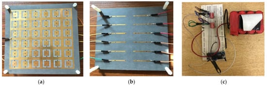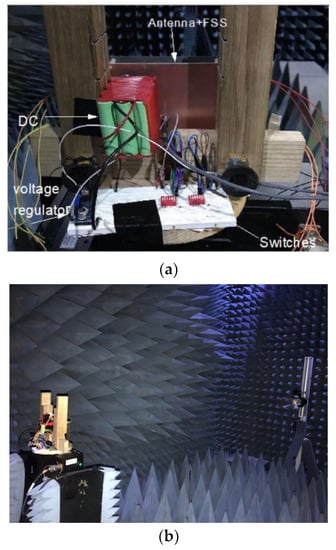 The proposed design is fabricated, and its performance is measured and compared with the simulated design results. Initially, a patch antenna is fabricated, and for simplicity, a planar FSS was fabricated. After that, a cavity is designed using Nylon spacers of 2.9 mm. The height between PRS and antenna is kept precisely to 27.7 mm, which is measured using a Vernier caliper. The overall structure has a size of 140 × 140 mm2. For biasing this structure, a separate circuitry is designed in the last step. A 12 V power supply is connected to the voltage regulator to regulate it to the desired value of 1.2 V. Two switches are used to control the four sections on the FSS structure, and four 18 Ω resistors are used to limit the current, as shown in Figure 8.