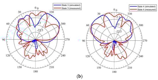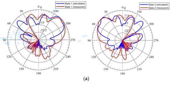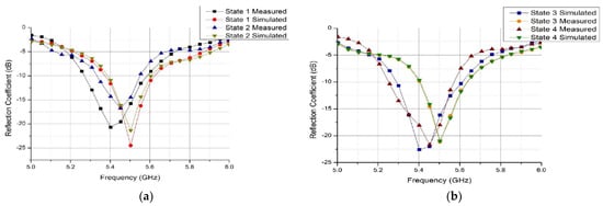 The reflection coefficient measurements of the antenna are conducted using Anritsu MS46122B Agilent Vector Network Analyzer []. It can be seen from Figure 9a that the 10-dB bandwidth of the simulated reflection coefficients of state 1 and state 2 are 5.29 to 5.6 GHz and 5.292 to 5.6 GHz and measured reflection coefficients are 5.24 to 5.6 GHz and 5.26 to 5.65 GHz, respectively. Moreover, Figure 9b shows that the 10-dB bandwidth of the simulated reflection coefficient of state 3 and state 4 are 5.4 to 5.62 GHz and 5.4 to 5.62 GHz, and measured reflection coefficients are 5.23 to 5.58 GHz and 5.25 to 5.6 GHz, respectively. The minor difference between the measured and simulated results are due parasitic effects of the actual PIN diodes. However, the four states agreed to each other with an achieved 10-dB impedance between 5.24 to 5.6 GHz frequency band.