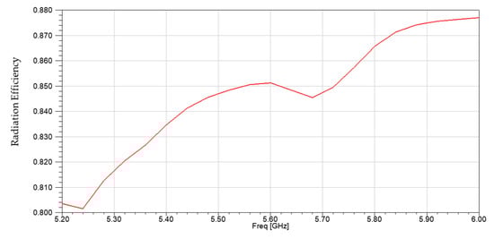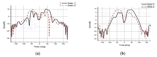 The gain pattern for all states are shown in Figure 12. The radiation efficiency results are shown in Figure 13 where an efficiency of greater than 84% is achieved at 5.5 GHz. The simulated and measured gain values for all four states at 5.5 GHz are shown in Table 3 which agree with each other very well. Table 4 provides a performance comparison of the proposed design with the state-of-the-art. In comparison with the design proposed in [,], the proposed design is able to realize a much wider beam tilt; with a much smaller size compared to []. The beam tilt range of the proposed design is almost double as compared to [,] with a reduced antenna size.