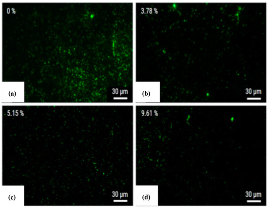 Amount of S. aureus bacteria on a Ti-6Al-4V surface, machined using (a) 0%, (b) 3.78%, (c) 5.15%, and (d) 9.61% silver on the dielectric fluid [39]. (With kind permission from Elsevier).