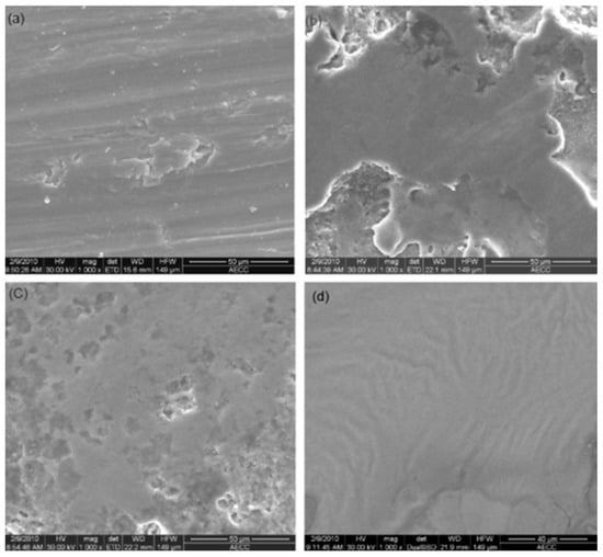 Scars produced due to corrosion in the (a) Ti-6Al-4V alloy, (b) ESA in air, (c) ESA in N2, and (d) ESA in silicone oil [44]. (With kind permission from Elsevier).