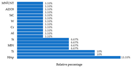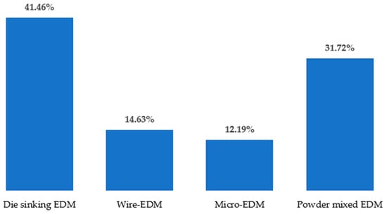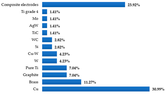 Different types of EDM processes have been used by researchers over the years to modify the surfaces of various materials as well as alloys that are electrically conductive. One of the advantages of the mentioned process is that no additional machines are required to coat the surface of the workpiece. In addition, the surface modification occurs almost naturally during the EDM process without special arrangement. The surface engineering using the EDM process does not require expensive equipment, corrosive liquid, or an inert environment. The EDM process itself is advantageous over other machining processes because of the minimum-to-no cutting forces, lesser cost associated with the cutting tools, and capability of machining some of the hardest and most difficult-to-cut materials. Figure 5 shows different types of EDM processes, whereas Figure 6 shows the variations in the electrodes that were considered to conduct this study. It is clear from this analysis that die-sinking EDM is mostly used by researchers, followed by other EDM processes. On the other hand, copper (Cu) is popular among researchers and is frequently used as a tool electrode due to its availability and high conductivity.