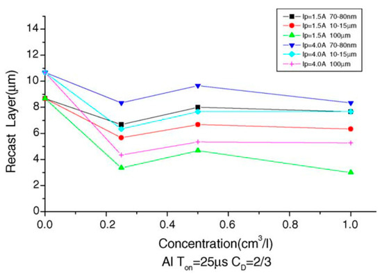 Yih-fong and Fu-chen [55] machined the surface of SKD 11 steel using powder-mixed EDM and found that the size of powder particles played a significant role in determining the surface quality. The roughness of the surface depended more on the particle size of the powder than the powder concentration. Among the powder used, the aluminum powder was found to be the best one in decreasing the surface roughness due to its excellent electrical and thermal properties. Additionally, they found that the recast layer thickness decreased when the powder was introduced in the dielectric. The variation of the newly formed recast layer thickness with the concentration of the Al powder is shown in Figure 10. The particle size was an important factor determining the recast layer thickness. The recast layer thickness increased with the decrease in particle size. The aluminum powder resulted in the thinnest recast layer, whereas the copper powder resulted in the thickest recast layer.