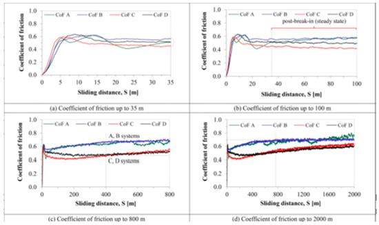 Change in the CoF with sliding distance. (a) AISI H13 steel; (b) H13 + SM-SEDM]; (c) H13 + SM-SEDM + TiAlN; (d) H13 + SM-SEDM + SR + TiAlN [90]. (With kind permission from Elsevier).