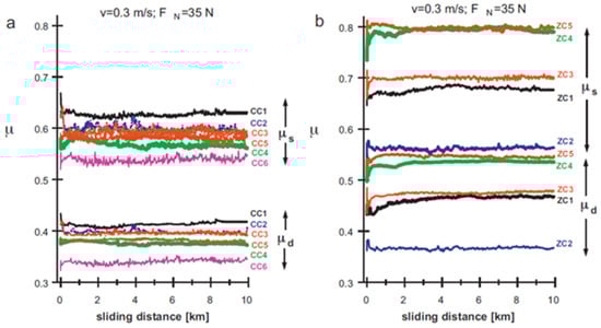 The friction curves tended to increase at first, then declined and finally increased again in order to achieve an equilibrium state (shown in Figure 12). They also observed that the friction curves fluctuated in the whole wear experiment. The micro-junctions that were situated on the contact surface experienced continuous breaking and regeneration. As a result, the interaction between the contact surface and the pin changed with the sliding distance. The tribological properties also highly depended on the surface finish. The CoF was the lowest in case of WC-Ni grade CC6. Moreover, the CoF as well as the wear level were the highest in the case of ZrO2-TiN grade ZC5.