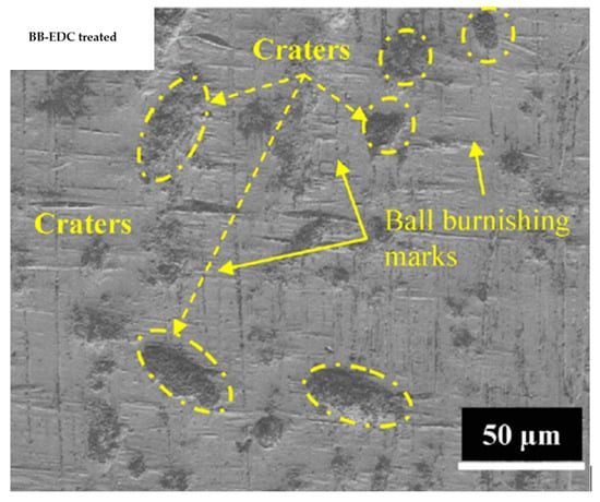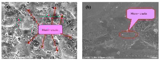 SEM analysis generates electron beams that strike and produce signals that contain information of the surface [93,94]. These informative signals are then converted to images. EDM process parameters such as peak current, pulse on-time, pulse off-time, etc., play a vital role in modifying the machined surface. Researchers use SEM in order to analyze the surface characteristics, which include the recast layer thickness, voids, cracks, globules, pockmarks, etc. of the EDMed surface. An AA606/10% SiC composite surface was modified by PMEDM [95]. The accretion of molten materials from the workpiece, tool electrode, and dielectric along with the powder particles developed a homogenous recast layer. The added tungsten powder resulted in a lower impact force on the surface and decreased the energy density as well, thus resulting in a smoother surface. Janmanee and Muttamara [87] compared the surfaces of tungsten carbide prepared by electro-discharge machining (EDM) and electro-discharge coating (EDC) processes using titanium powder suspension. The SEM micrographs, which are shown in Figure 13, confirmed that the EDC process produced a flatter recast layer with less microcracks compared with the EDM process when the current and duty factor were kept constant. The titanium powder entered into the microcracks and voids, resulting in a smoother surface and lower crest height in the case of EDC. This was also the reason behind the lower roughness of the surfaces prepared by EDC. The effect of current was studied, and the authors found that at current = 20 A and duty factor = 50%, the optimum Ti coating was 20.32%, revealing that this current was suitable for the experiments. The bonding ability decreased with the increase in current from 20 A. They also studied the effect of the duty factor and found that at duty factor = 50%, the optimum Ti coating was 21.46% and the thickness of that coating was 5 µm.