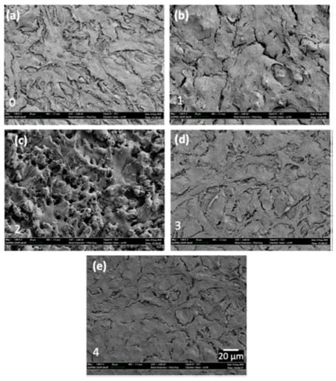 The materials can corrode inside the body when used as an implant due to motion, plaque formation, and irregular cleanliness, which results in releasing harmful ions into the body fluid [40,41,42]. The corrosion performance of the implant material can significantly increase by generating a layer or modifying surface using EDM [43]. Bin et al. [44] investigated the feasibility of enhancing the corrosion resistance of a titanium (Ti) alloy surface machined by using three different dielectrics and a graphite electrode in an EDM process. The surface machined by using air as the dielectric fluid had the poorest corrosion resistance, even from the original Ti alloy, which is shown in Figure 4. The surface obtained using air as a dielectric becomes more prone to corrosion because of the poor surface quality, consisting of micro-cracks and pores. The machined surface layer generated by nitrogen consisted of fewer micro-cracks and better corrosion resistance than the previous one. The workpiece that was machined by using silicone oil as the dielectric provided the best corrosion resistance result. Sharma et al. [45] performed the corrosion test on a coated Ti alloy, which was prepared by using boron nitride powder. The coated alloy came out with a better result than the parent alloy in both stagnant and flowing water conditions. The corrosion rate was lower on the coated alloy due to the formation of TiN and TiAlN during the EDC process.